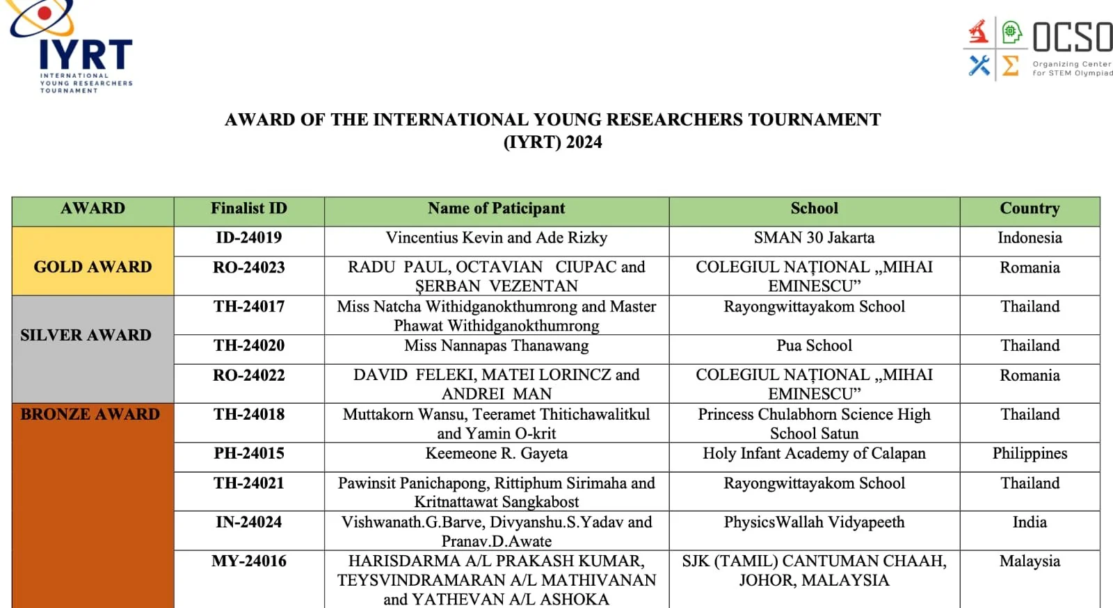 INTERNATIONAL YOUNG RESEARCHERS TOURNAMENT (IYRT) 2024